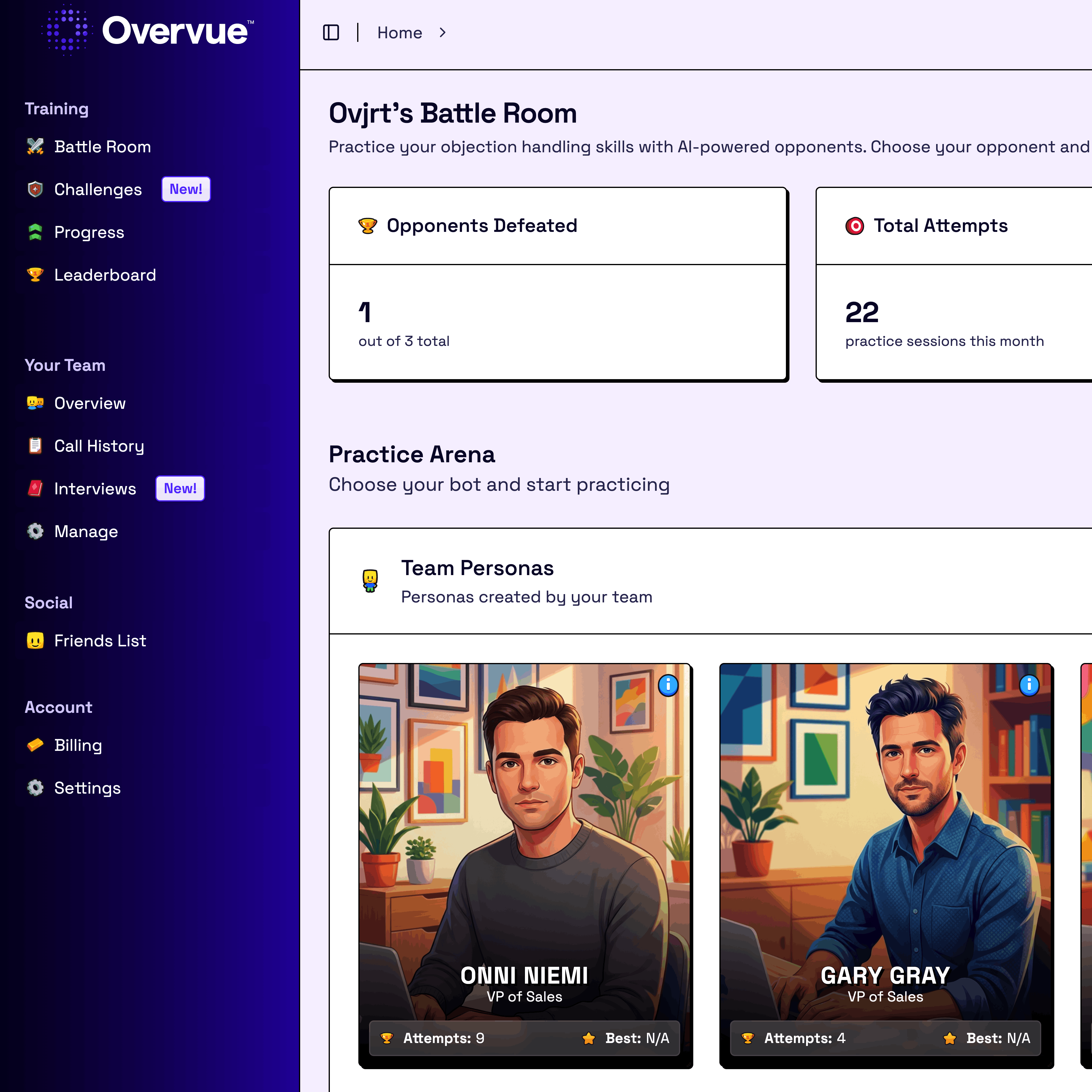 Overvue lets you create unlimited AI buyer scenarios for different personas, objections, and deal stages.