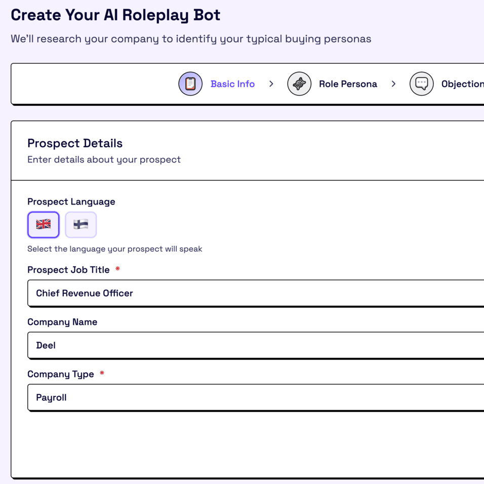You define real-world details your reps hear every day: company context, role, pain points, common objections, competitors, and tech stack.